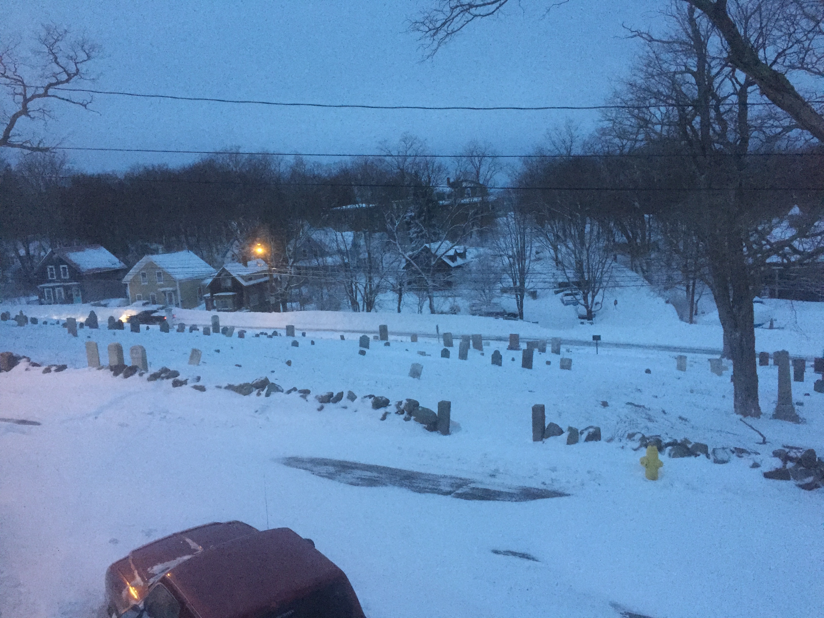 At the height of the storm, this was all I saw directly across the street. It made me think: “I’d like it if the snow would just STOP.” It snowed in Rockport this morning, and now Juno has moved on. There are no cars on the road.