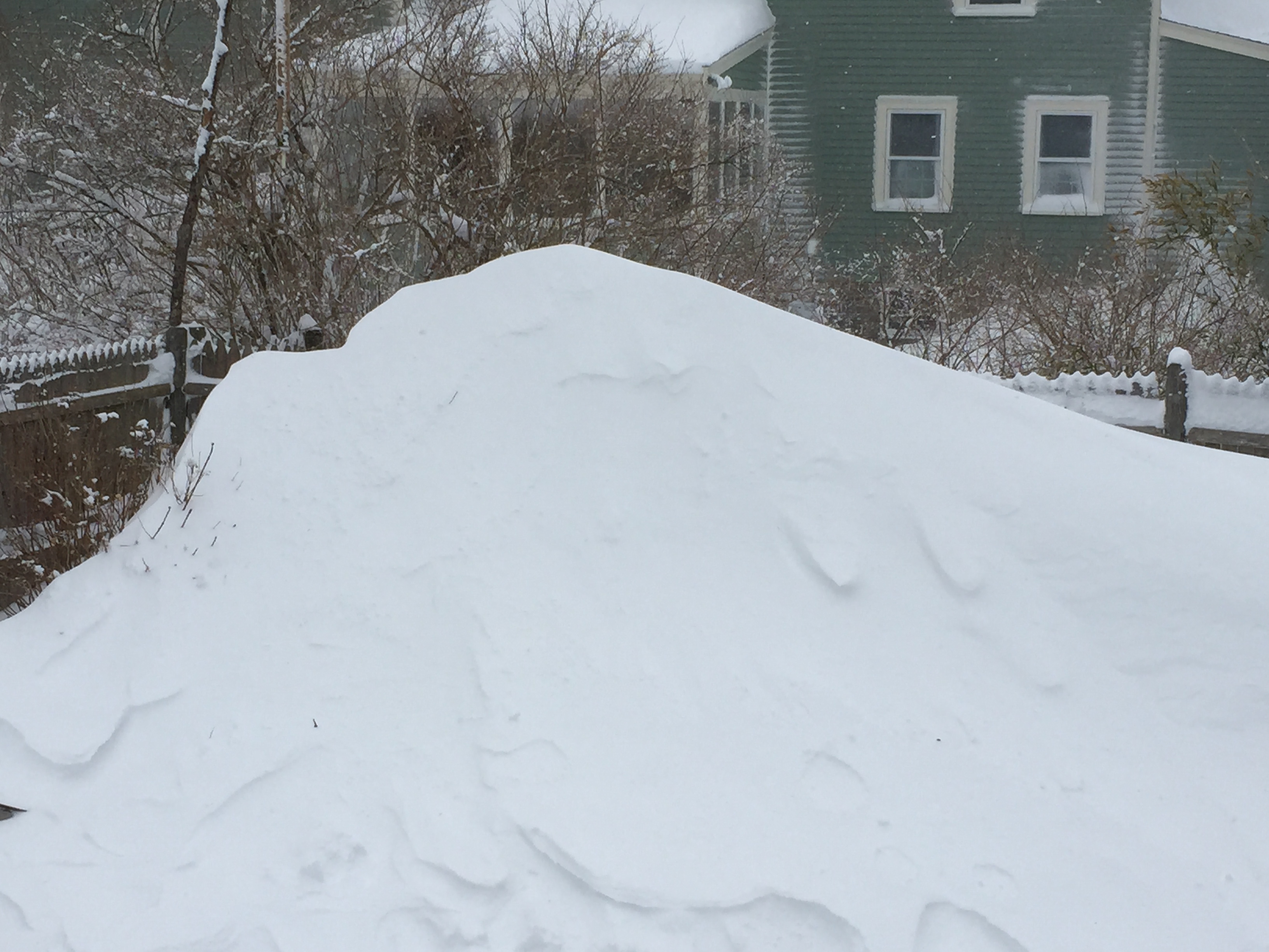 We’ve been judging the ridiculousness of it all by the size of the massive snow drift in the back corner of our yard. It is now many inches over our fence and prime for more stand-up sledding in a little while. We have also been laughing at the scary dorsal fin that has been rising from the depths of the snow on our deck.
