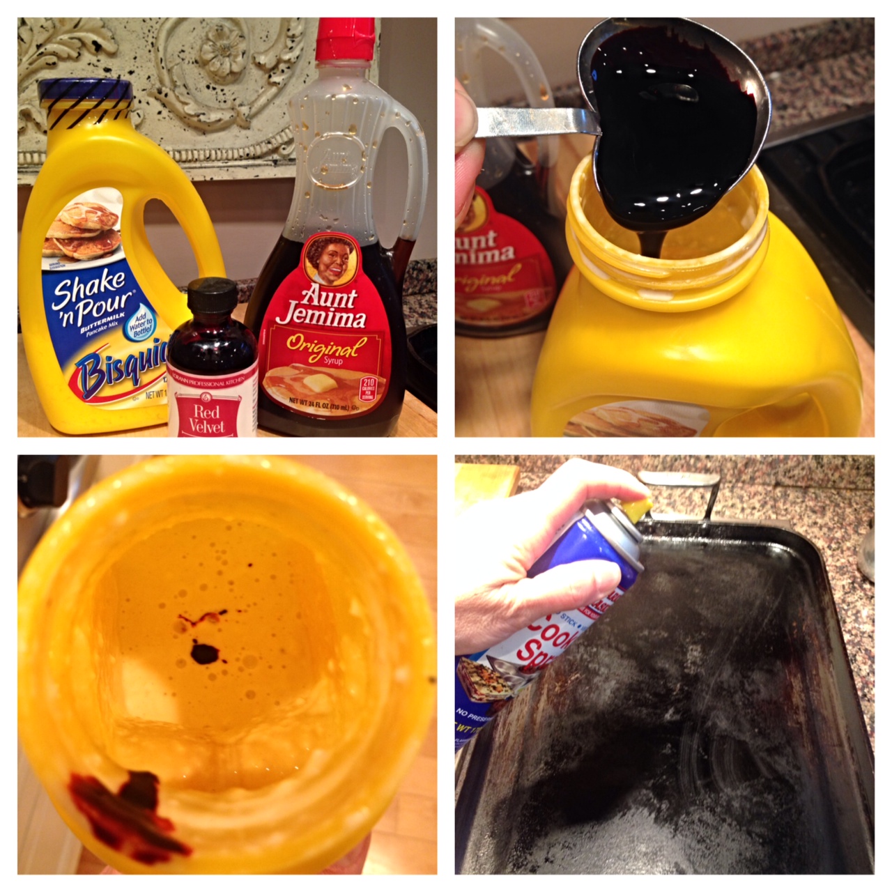 1 follow Bisquick manufacturer’s directions; add 1 tablespoon red velvet flavoring to pancake batter; shake until evenly incorporated