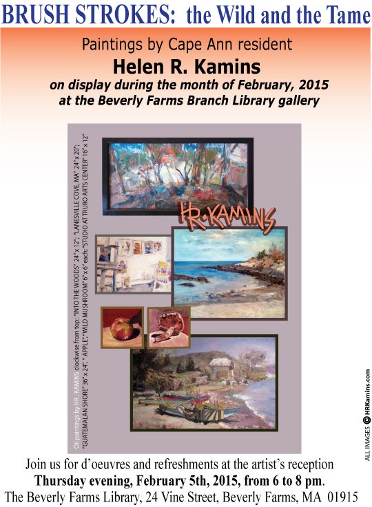 Well, since the snow and cold thwarted a lot of folks from making it to the Opening Reception of my solo show at the Beverly Farms Library, there will be an informal gathering to ‘Meet the artist’ on Thursday, February 26th from 5 to 7 pm. The show is coming down on the 28th so it would be great if you could make it.
