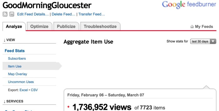 Here are some of the latest numbers from Feedburner (which is the email blast that people who have subscribed to GMG get emailed to them at the end of the night) and The GMG Facebook Feed. These numbers don’t include the stats of people who directly visit Good Morning Gloucester via the blog itself by clicking a direct link to it.