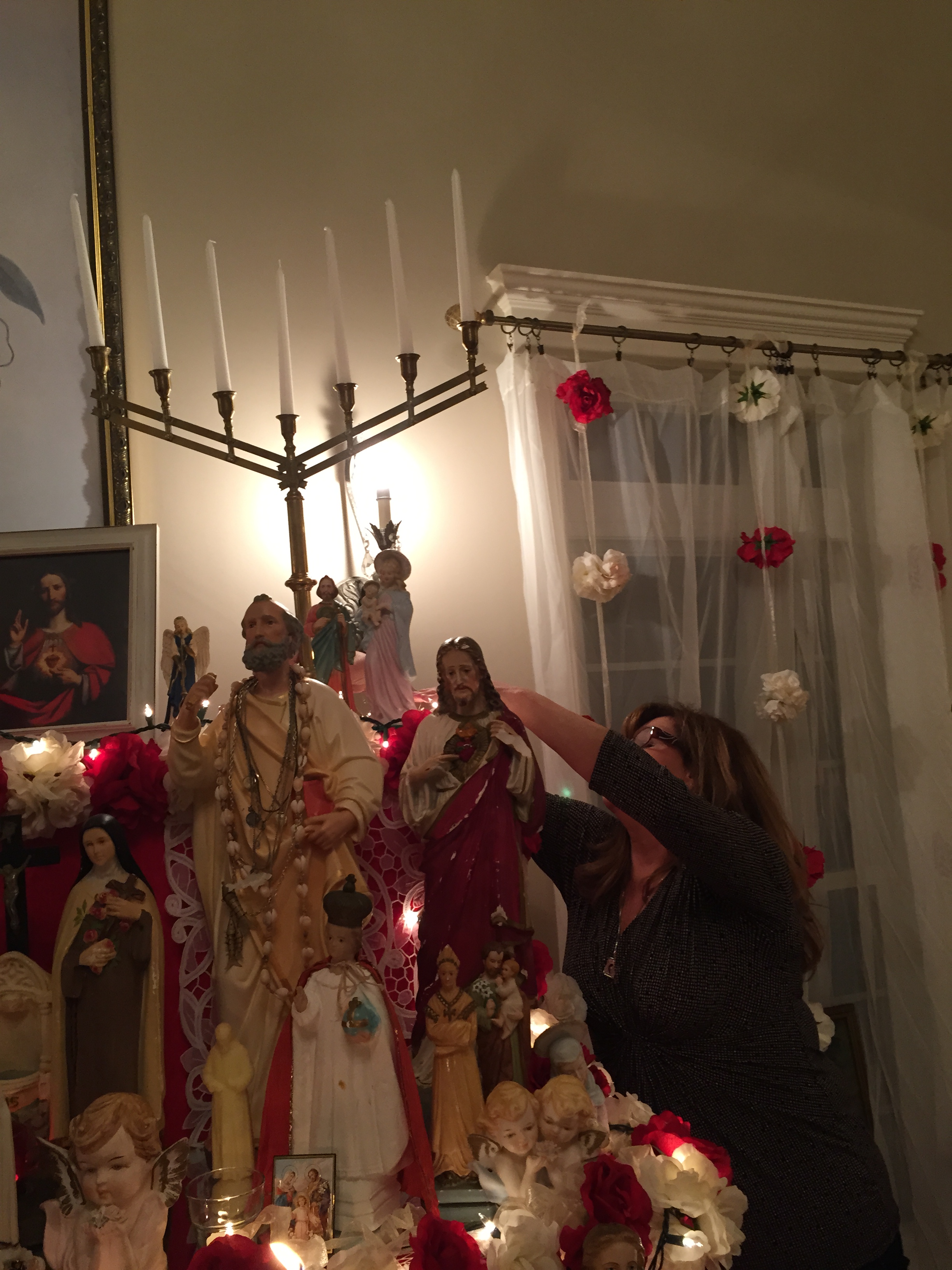 Last night before the we began the first rosary of the season, Dolores Sheehan and her son John placed the Linquqta Family Candelabras onto the top tier of our altar with their Linquata cousins and relatives in attendance. Just piror to our prayer service, Dolores invited her cousin Nicole Imbrunone Curcuru up to the altar to have the honor of lighting the candles. The glowing candelabras lit the altar beautifully as my dear friends Roasile Olrando Foti lead us in prayer.