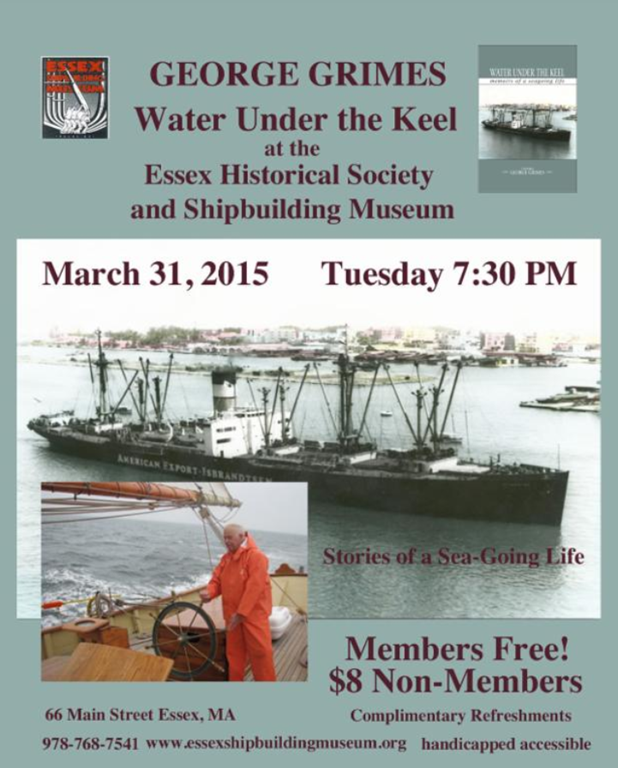 Please join us at the Shipbuilding Museum on March 31 at 7:30 PM as Master Mariner, Captain George Grimes of Rockport shares stories of a life working at sea. Remember, this program is free for museum members!