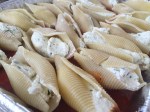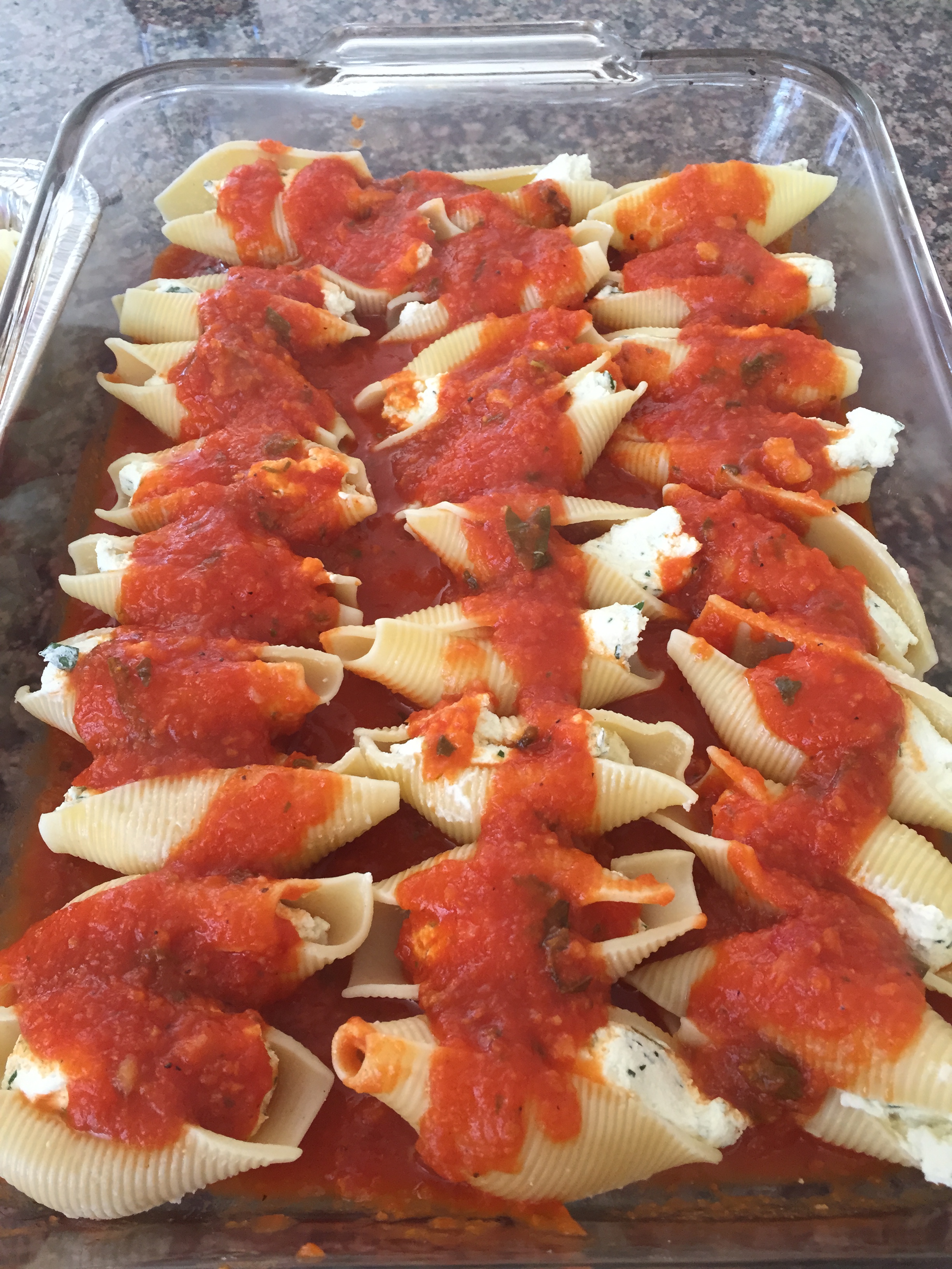 4 arrange filled pasta shells, stuffed side up on top Sunday Sauce lined baking dish