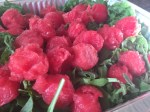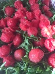 1 place arugula in serving bowl; top with watermelon balls, crumbled feta cheese, and red onion slices