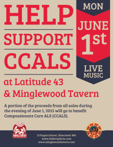 Head to Latitude 43 or Minglewood Tavern this Monday, June 1st to support Compassionate Care ALS (CCALS); just come in any time after 4:00 PM and the restaurant will automatically donate a portion of your check to the cause!