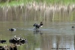 I was standing so still while filming yesterday morning that I don’t think the female mallard was at first aware of my presence. What a wonderful treat to see she and the ducklings emerge from the reeds growing along the water’s edge. They are amazingly fast and adeptly darted through the water and across the beach, as though they had been born months earlier. I was getting a tremendous cramp and had to stand quickly, which was mama mallard’s cue to chide the ducklings back into the tall grass.