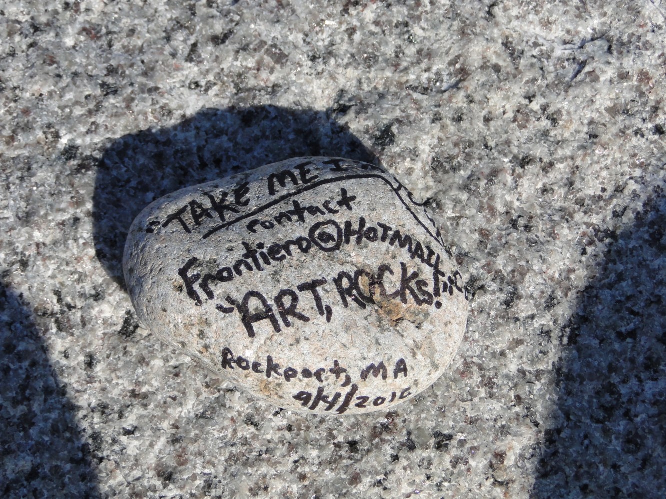 I received an email a few weeks ago from a 10 year old boy who when he was nine years old at the time he found one of my “Art,Rocks!” a Rock that I left at T-Wharf in Rockport on 09/04/2010. I think that was about 9 months ago. I remember leaving it there after having a cup of coffee and watching the Lobstermen get ready for their day. About 5am. I always wonder about the ones I leave that don’t get reported back to the email I leave on them. Currently the last three that I’ve left in the past two weeks that I never gave notice on GMG Have not been reported back. Which is fine. In this world we live in now, maybe people think there is a catch too this thing. Maybe they think I want money for it. Emails like Coopers who found it is payment enough! I will never ask anything for them. An email would be nice but, If I don’t get a response that’s fine too! Mystery and fantasy is what makes life! isn’t it?