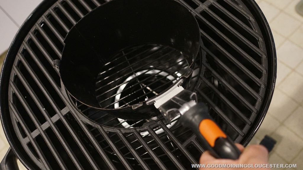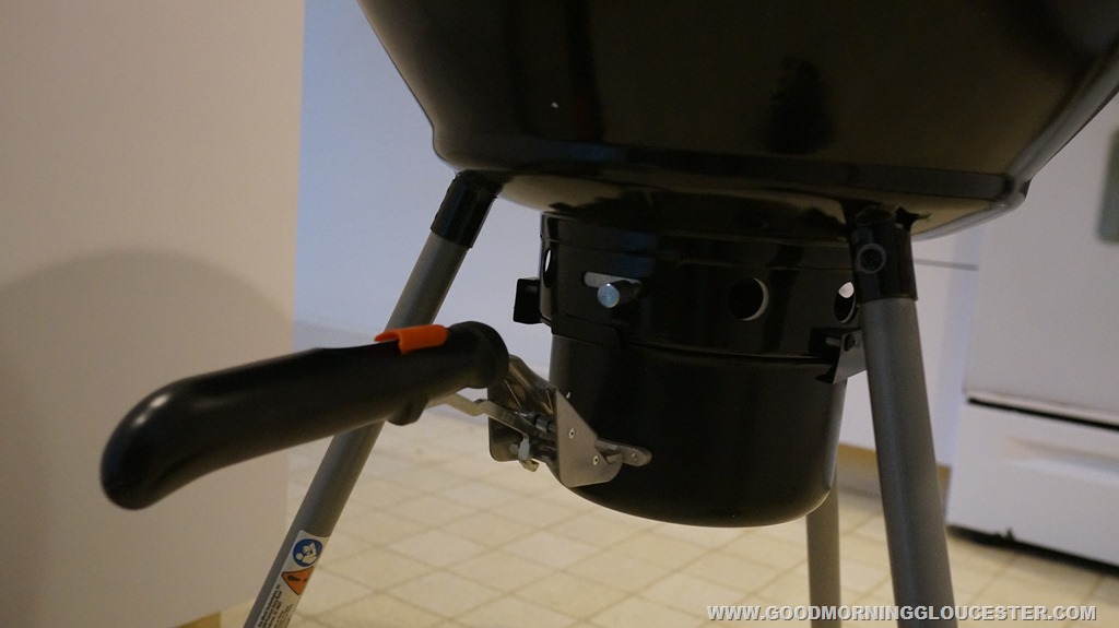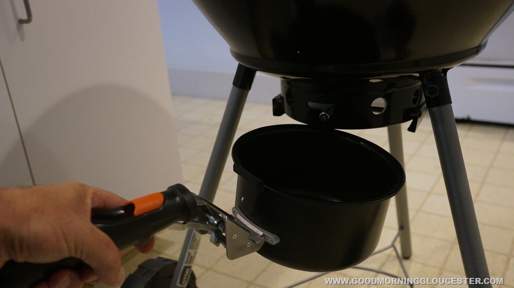 I ordered a rapidfire chimney to start the coals not realizing that the charcoal basket in the center is built as a removable chimney starter. The chimney will be returned because there’s no need for it so there’s another $15 in savings over the Weber. Starting the charcoal was as easy as placing a couple pieces of newspaper in the bottom of the charcoal basket, placing the charcoal on top and lighting the paper. It ignited and caught first try without any need for lighter fluid or charcoal soaked in lighter fluid. There is also a removable ash canister which slides into a channel under the grill and collects the spent charcoal so it won’t allow it to blow all over the deck or patio.