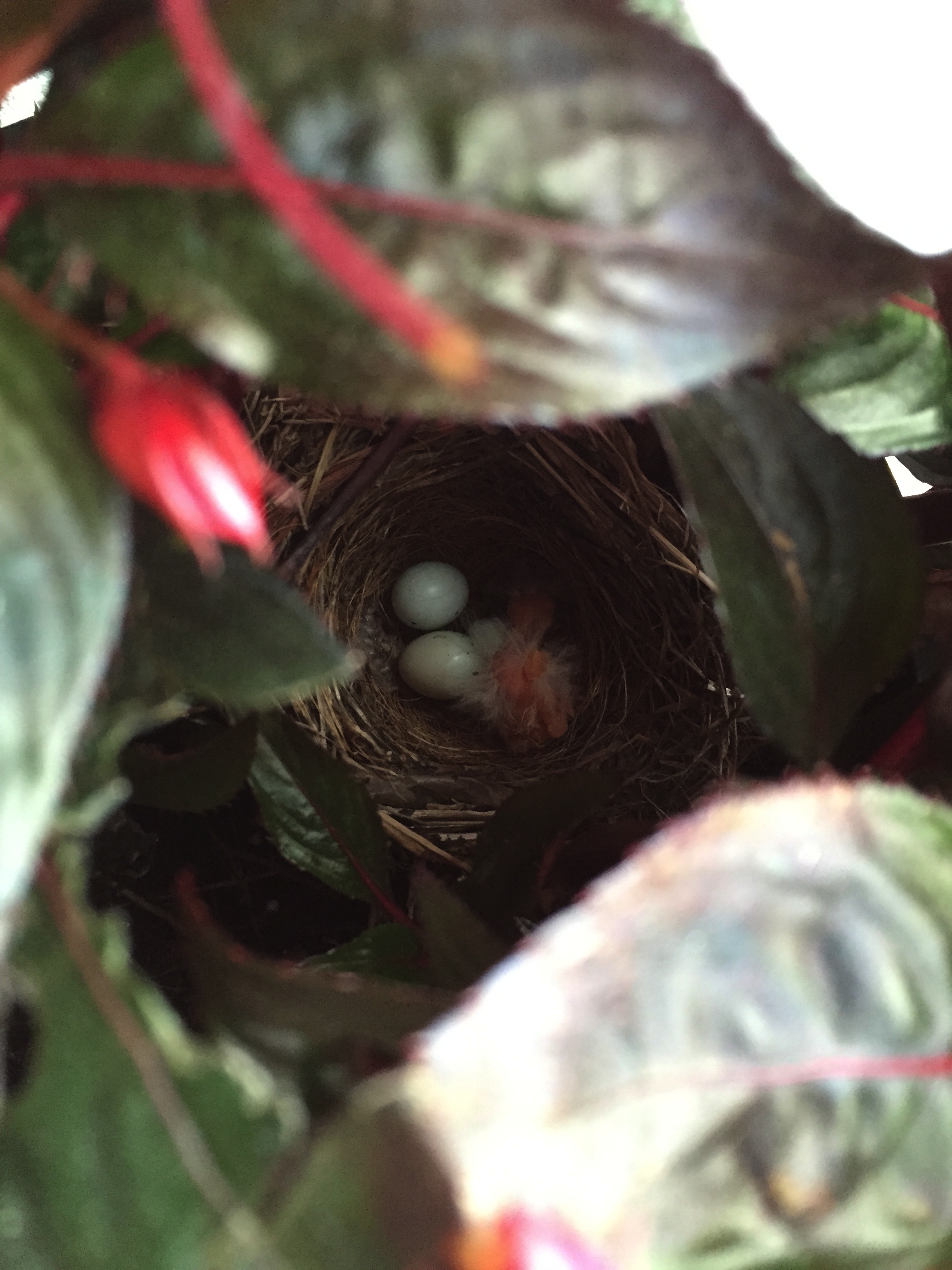 For the past week or so, each and every time we come and go through our front door, a momma house sparrow (I think) takes off from one of our hanging plants and sits in a nearby tree until the coast is clear.