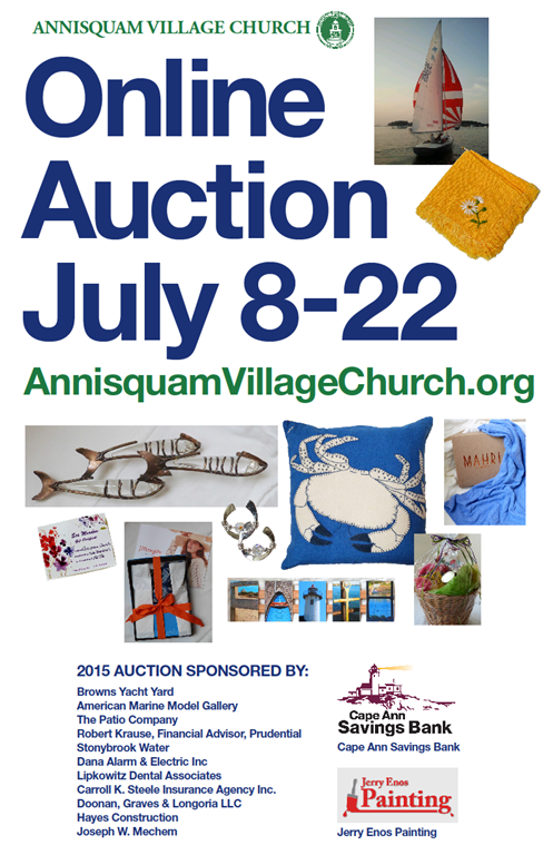 Our annual online Auction to support the extensive outreach of The Annisquam Village Church is ready to launch! It runs July 8 through July 22 and we have donations from all over Cape Ann that will make for lots of fun bidding. I have a poster that is going up around town, and we are hoping that you can post this on Good Morning Gloucester! And bidding is easy by going to http://www.annisquamvillagechurch.org and there is a direct link to the Auction.