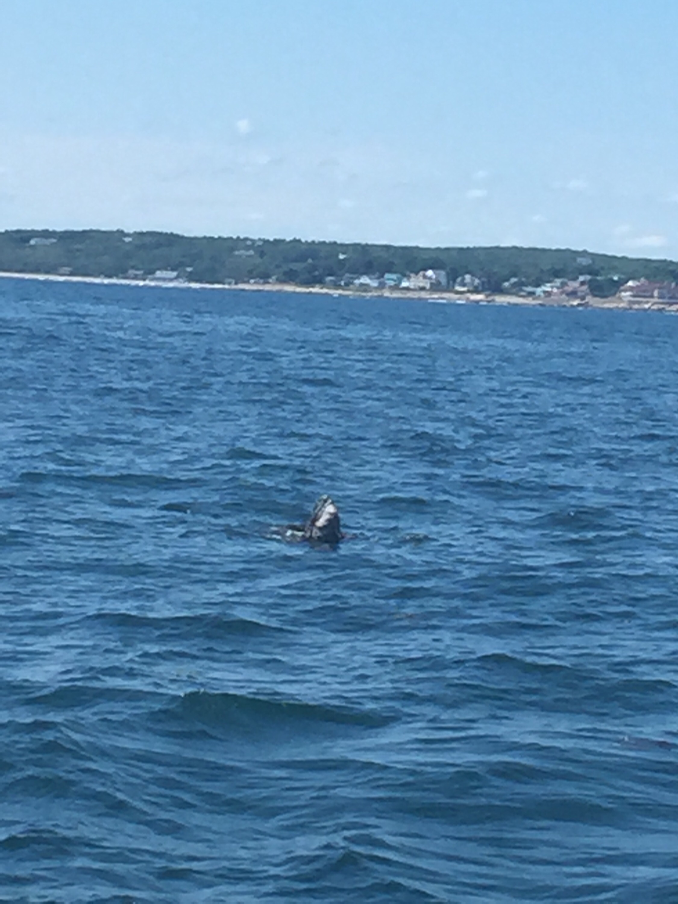 Friends of ours were sailing just outside the Eastern Point breakwater when they spotted this guy or gal! Before getting close enough to clearly identify it, they said that the huge head almost looked like a very small humpback whale calf. Upon closer inspection it was, without a doubt, a massive turtle!