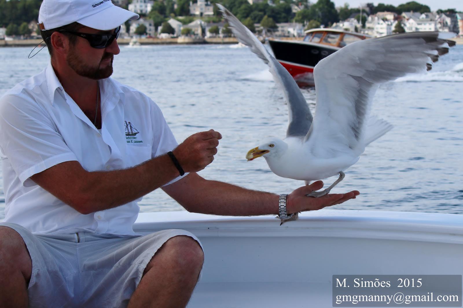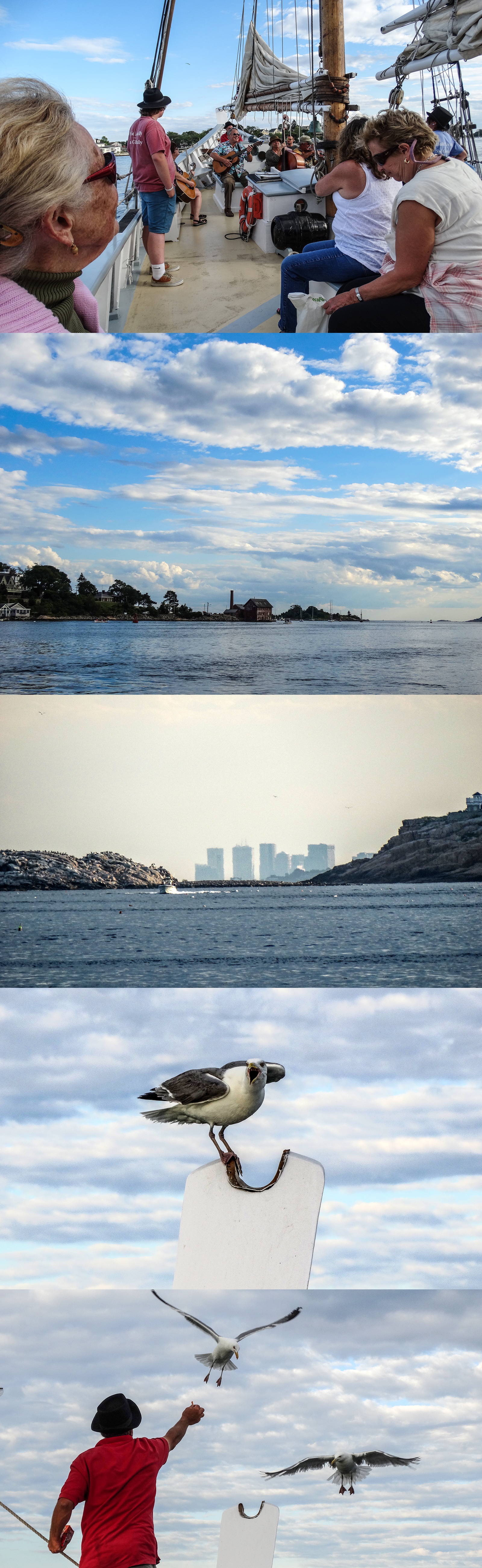 Took Mom for a sail on Ardelle last Thursday. It was a beautiful evening and a great way to spend two hours out on the harbor. There was a marvelous four piece band playing, called Down Home Swing, who entertained us the whole trip, that is when Harold wasn’t entertaining us with his feeding of the demanding visiting gulls.