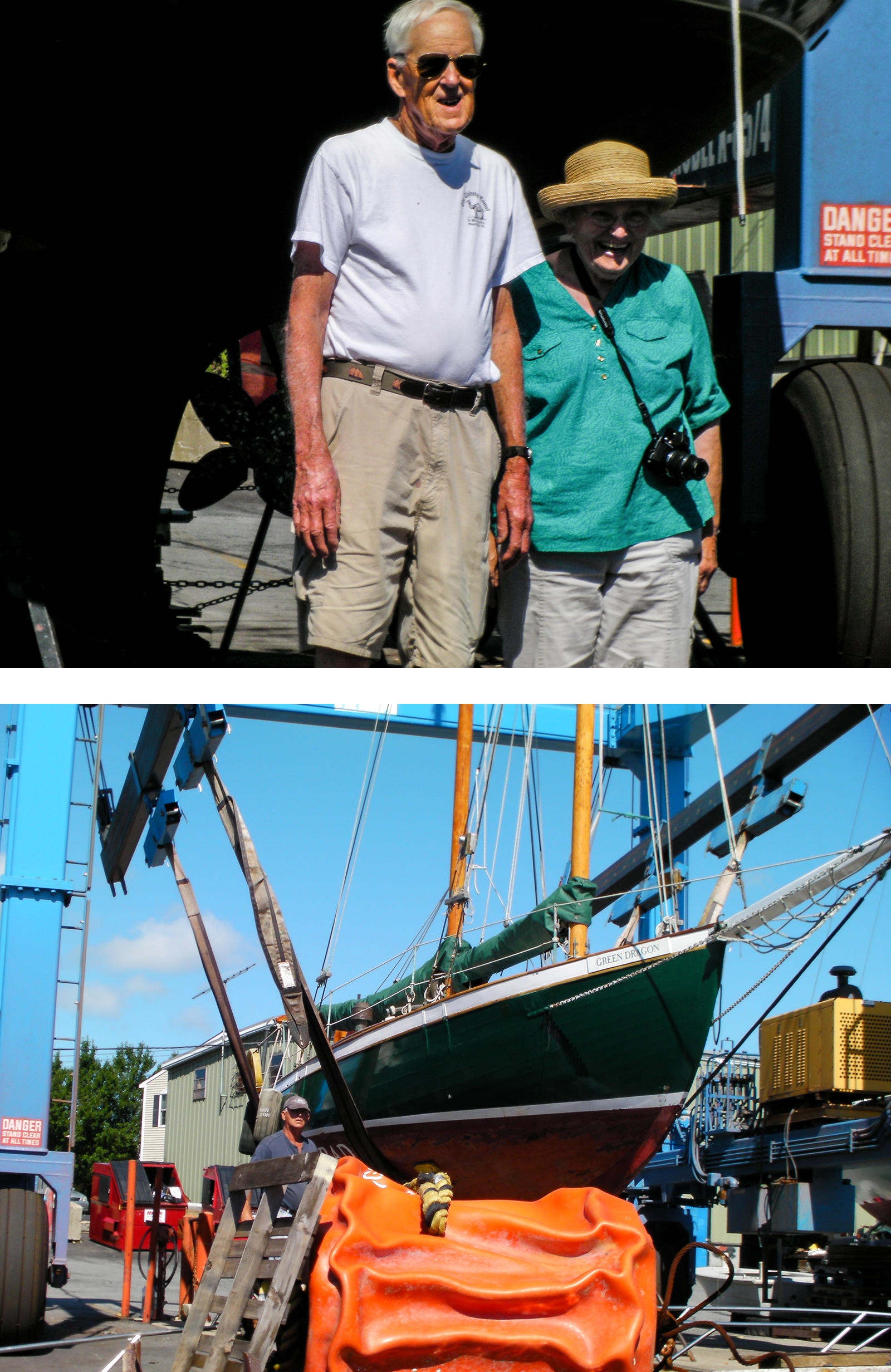 Al and Phyllis Bezanson at the Railways with Green Dragon who sprung a leak after a race in Marblehead last weekend. Al looks a little disconcerted, as he would much rather be out sailing her now than seeing her on dry land. Hopefully she will be seaworthy and back out sailing soon – the Schooner Festival is just around the corner.