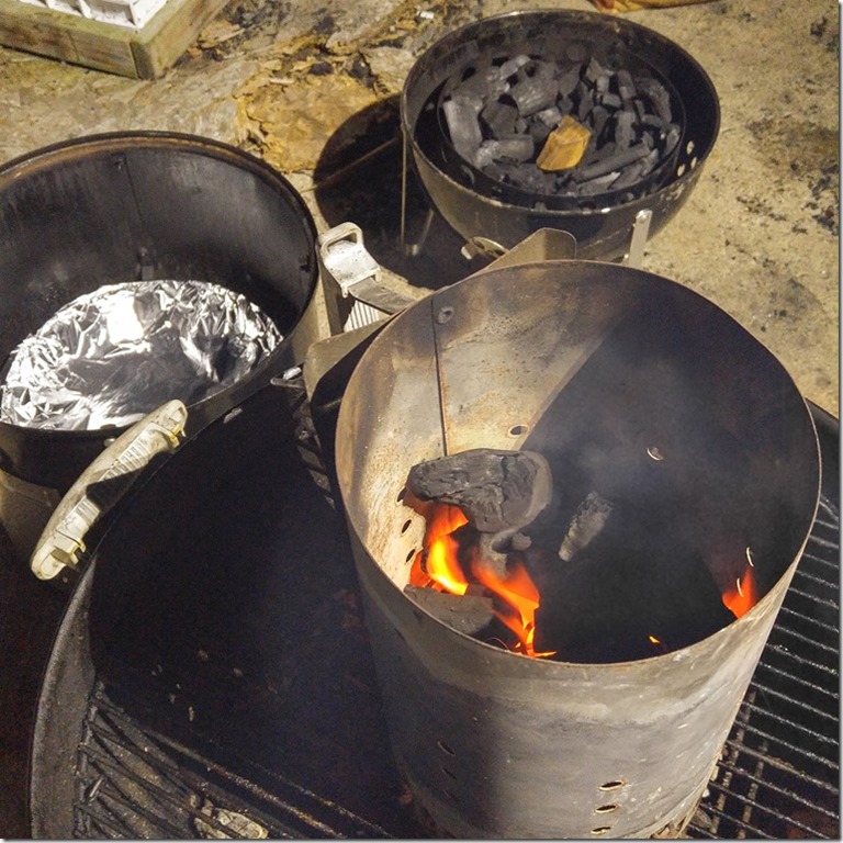 5:00AM 8/30/15 set up the smoker using the minion method. Filled up the charcoal basket after placing four chucks of cherry in equal distances apart around the circle. then took out the middle lump charcoal , got it going in the chimney and then once they were burning red I dumped them back into the center. The idea is that the charcoal will slowly burn from the center outwards for a long low and slow session.