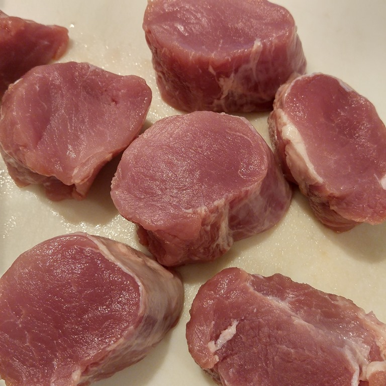 You’re going to slice the pork tenderloin into medallions about the width of the slices of bacon (makes sense since you’ll be wrapping them)