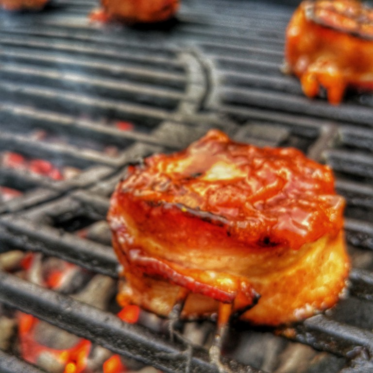 So klet them sit for 2-3 minutes, when you see the bacon start to curl just a bit on the bottom, rotate each medallion a half turn to get some nice hash marks and then grill for another 2-3 minutes.