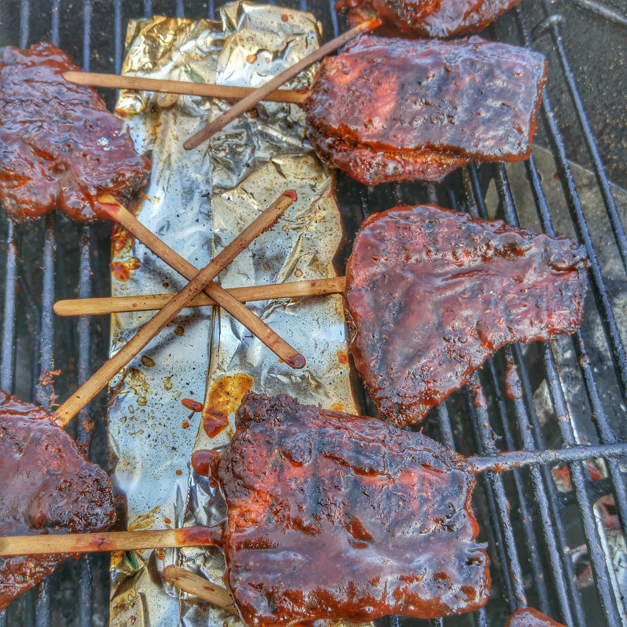 Be sure to soak your popsicle sticks in water for at least twenty minutes to get some moisture in them so they don’t burn up during the cook. I folded over a piece of tin foil and placed it under the popsicle sticks for a little insurance.