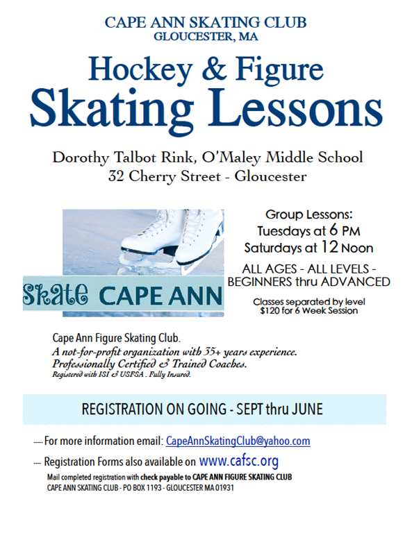 I represent Cape Ann Figure Skating Club (non profit organization) — and we are looking to get the work out that Skating Lessons start soon.