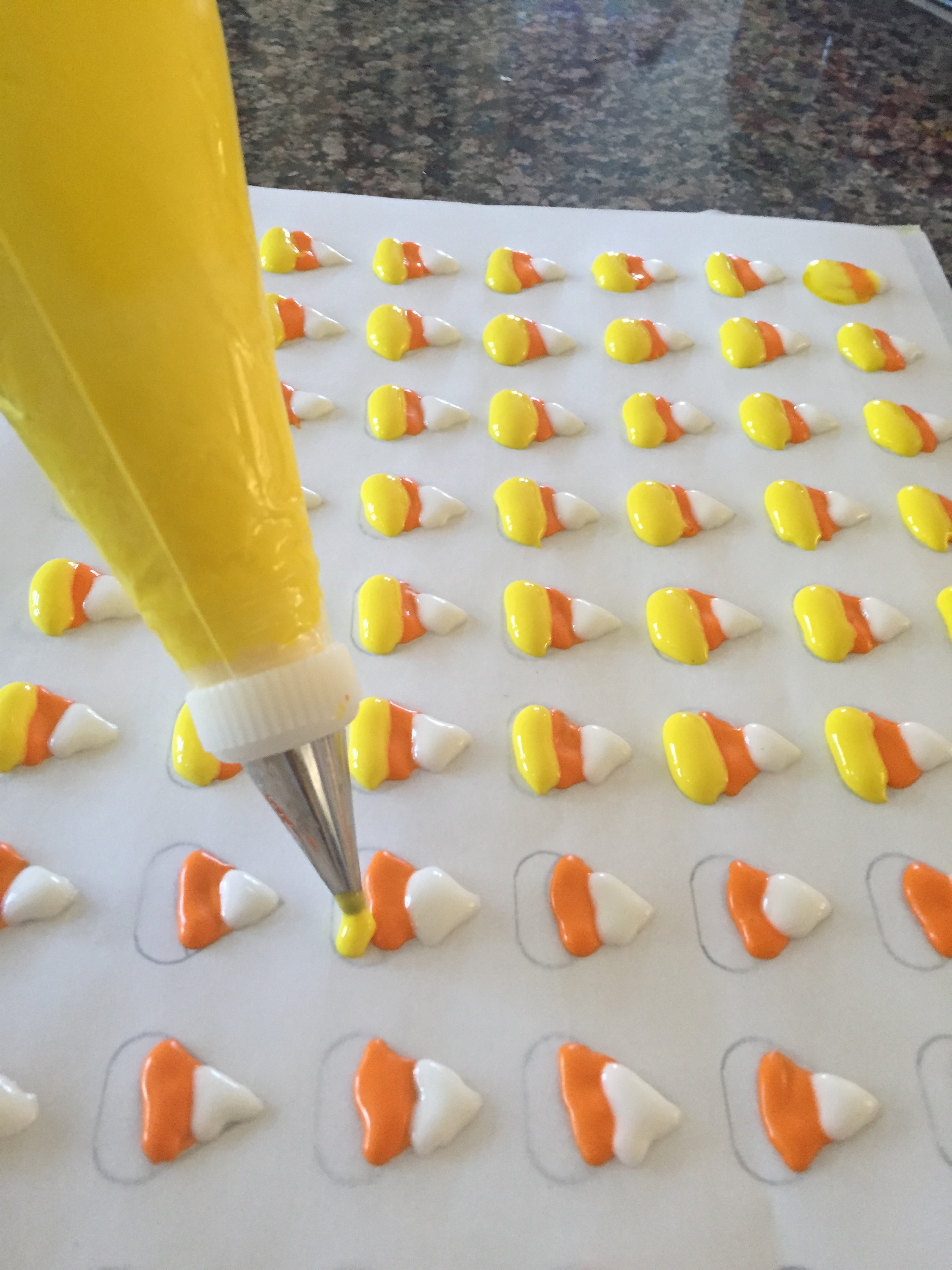 At midnight After peeling off and eating each and every dried dot shaped Royal Icing from my work space, I decide to pip my left over Royal Icing onto a clean sheets of Parchment paper, in the same fashioned pattern I remebered buying at Berths On Rocky Neck! This morning I searched the internet for a clip art shaped Corn Corn, and confected these adorable Candy Corn Shaped Sugar Treats!