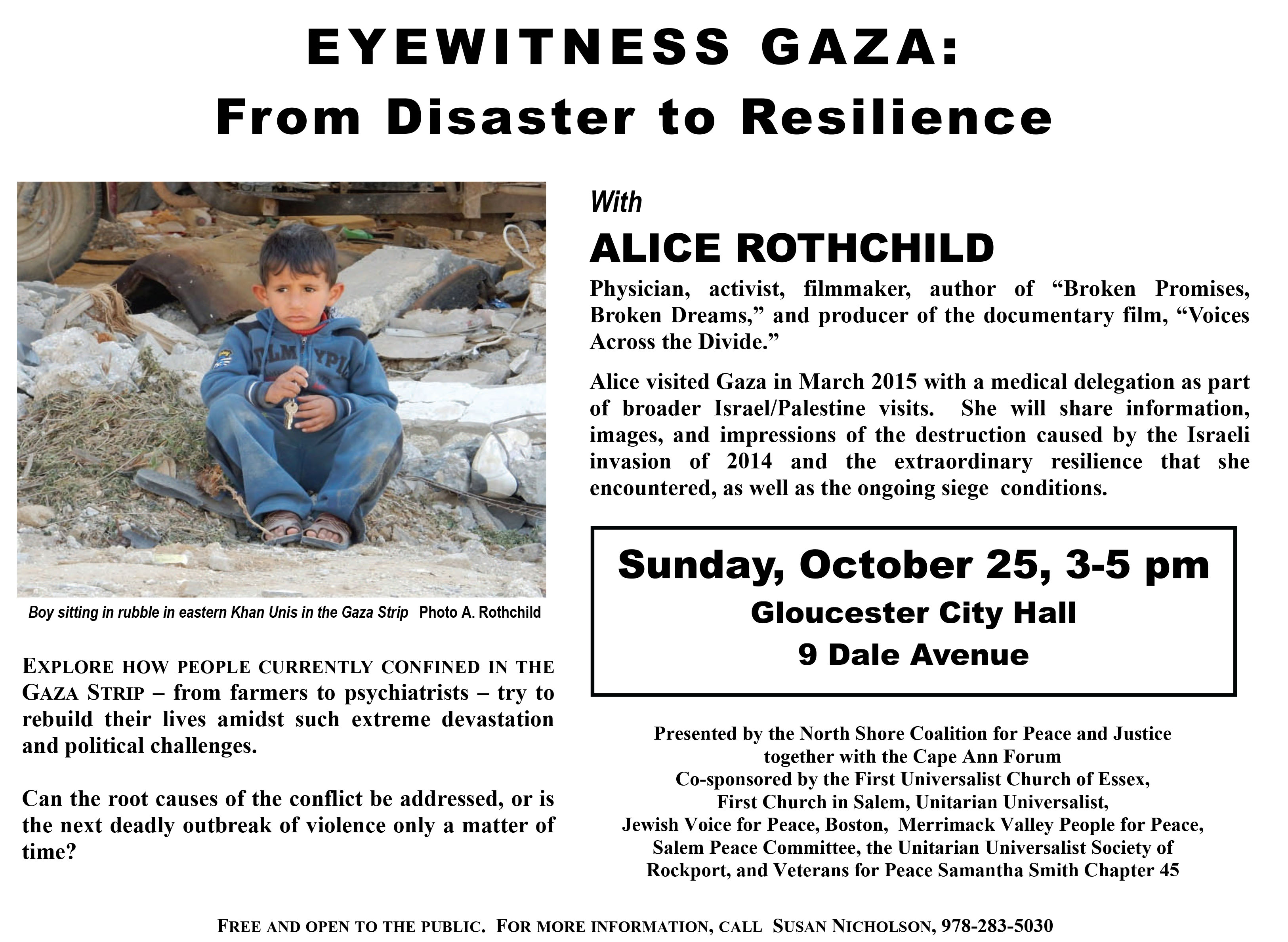 On Sunday, October 25, the North Shore Coalition for Peace and Justice (NSCPJ) together with the Cape Ann Forum, will present Eyewitness Gaza: From Disaster to Resilience with Alice Rothchild, at Gloucester City Hall, 9 Dale Avenue, Gloucester, from 3-5 pm.