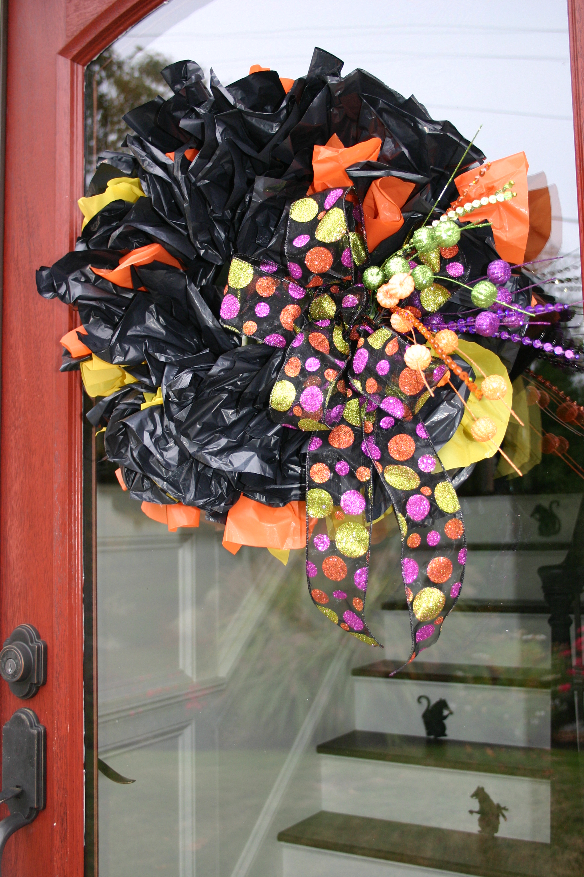 3 Tie orange and yellow pieces evenly spaced around wreath; fluff and open all pieces