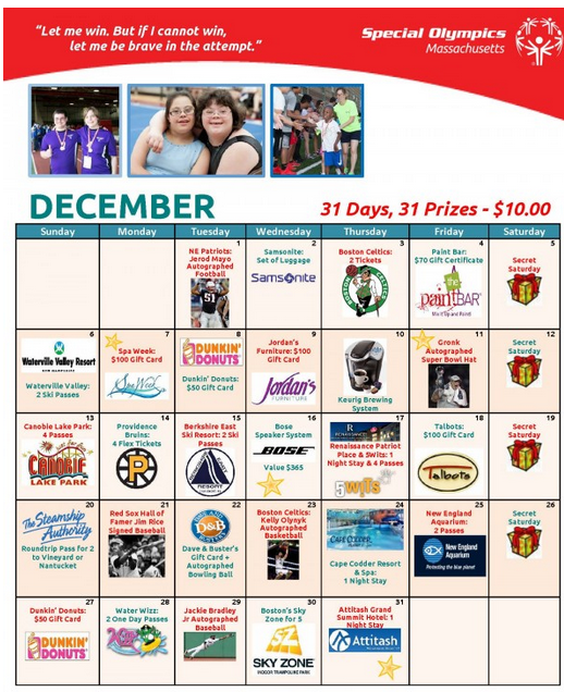 The 2015 “31 Days, 31 Prizes” Calendar Raffle is a fundraising event conducted by the Special Olympics for the month of December. It features 31 prizes, which will be raffled off one per day throughout the month. Each calendar holds one entry to win, and can be purchased for $10 until November 30.