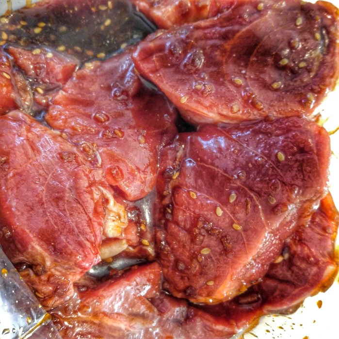 Tuna Assassin Jimmy Santapaola was kind enough to bring me some tuna steaks from his latest trip, landed less than 24 hours ago, I’ve got them cut into one inch mini steaks and into an overnight marinade.