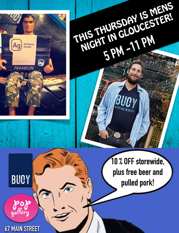 Tonight, while you’re out with your buoys, having a grand time on Main Street for Mens Night, please stop into Pop Gallery for beer, pulled pork sliders and 10% off storewide! We will also be accepting donations for David Sutherland’s family.Â
