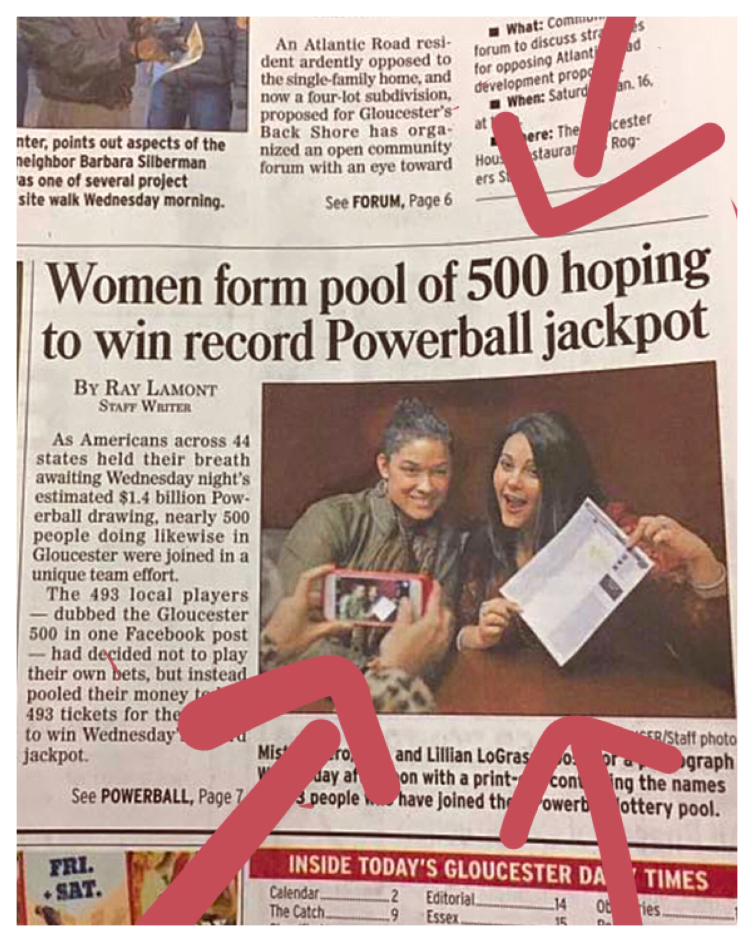 Durring yesterdays interview with Gloucester Powerball Organizers Lillian LoGrasso & Misty Amero I asked both ladies to pose for a photo with the official Group list inbetween calls from verious media outlets! Today a photo of this occursnce was highlighted on the front page of the GDTimes!