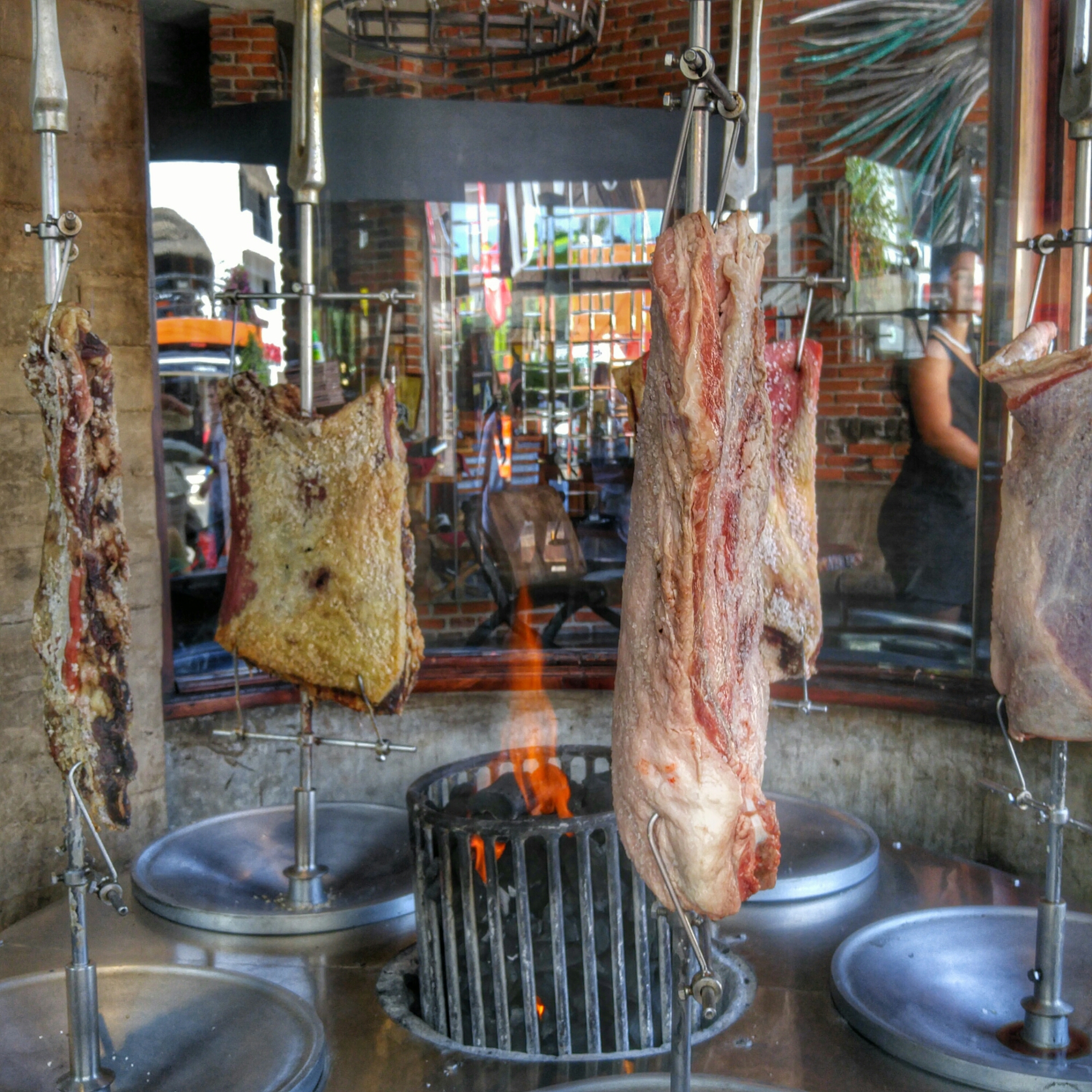 Found this vertical setup interesting. I’d think it would be more apt to self baste in its own rendered fat if it were horizontal instead of the juices sliding down and off of the meat completely in the vertical setup. Must be a reason for it. Seems like a ton of salt packed onto the meat as well.