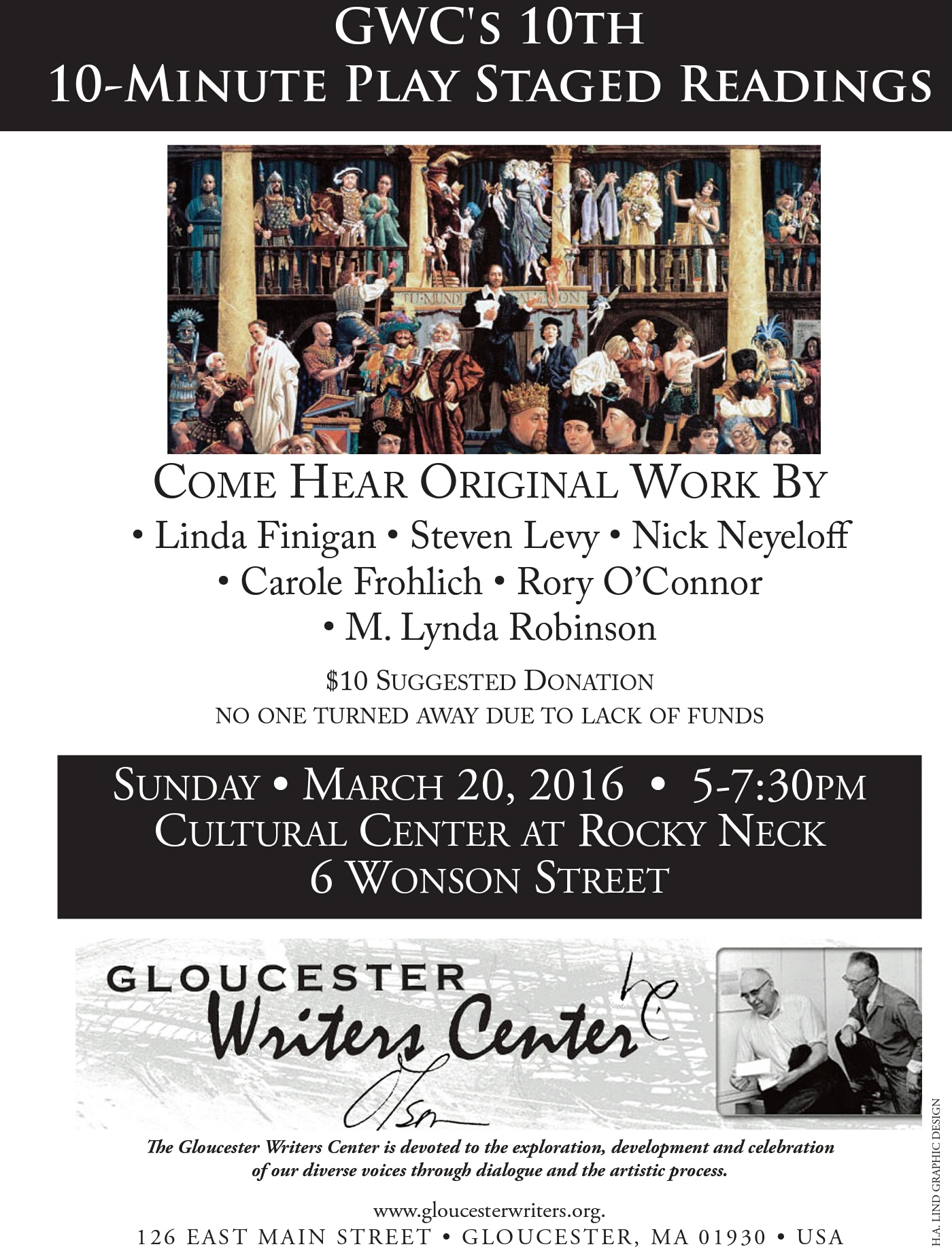Six ten minute plays written by 6 local playwrights who are participants in M. Lynda Robinson’s workshop at the Gloucester Writers Center will be given a Staged Reading performed by professional actors at the Cultural Center of Rocky Neck on Sunday, March 20, at 5pm with a reception to follow. The Audience is encouraged to participate with feedback which will be given to each playwright. The six playwrights are Cape Ann’s:  Linda Finigan, Carole Frohlich,, Steven A. Levy, Nick Neyeloff, Rory O’Connor, and M. Lynda Robinson. The actors include David McCaleb, David Adams, Debbe Lewis, Tess Deegan, Phil Thompson, and Rebecca Lerman.