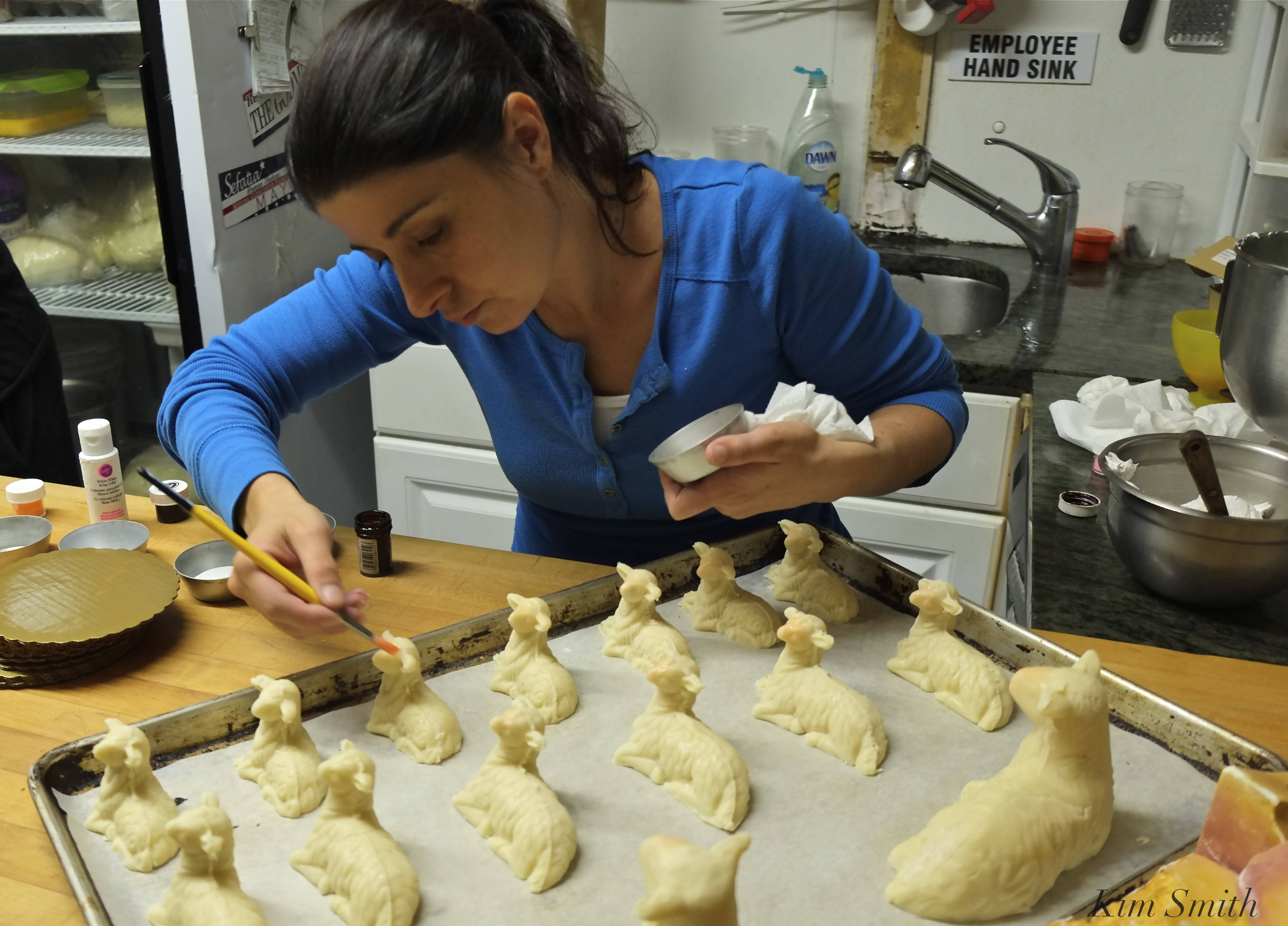 Each lamb is molded from almond dough and after drying, skillfully hand painted by Maria. I popped into Caffe Sicilia Wednesday morning to say hello and happily caught Maria just as she was beginning to paint and decorate the Easter lambs. We filmed her working with my movie camera for Gloucester’s Feast of Saint Joseph Community Film Project and here is a glimpse with iPhone photos and Instagrams.