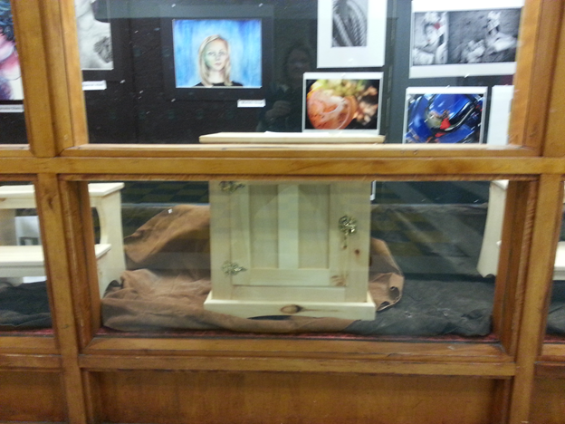 The big clear display box will be mounted on top of a wooden cabinet. We were excited to see an example of a beautiful cabinet created by the GHS wood shop! Maybe they could do the pedestal for the case. See the close up photograph we took on the day that Caroline Enos interviewed us for The Gillnetter.