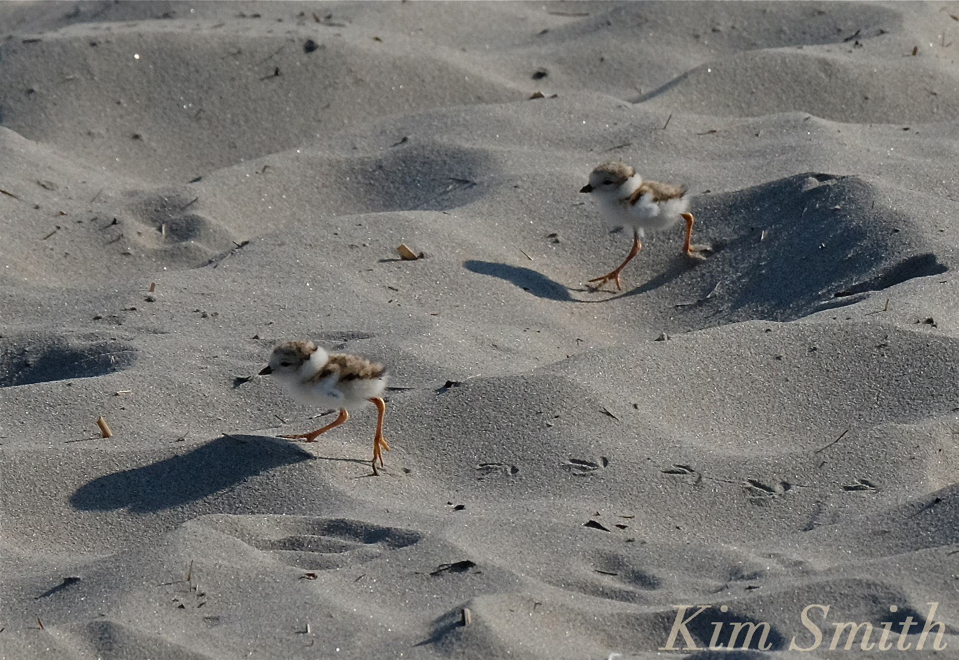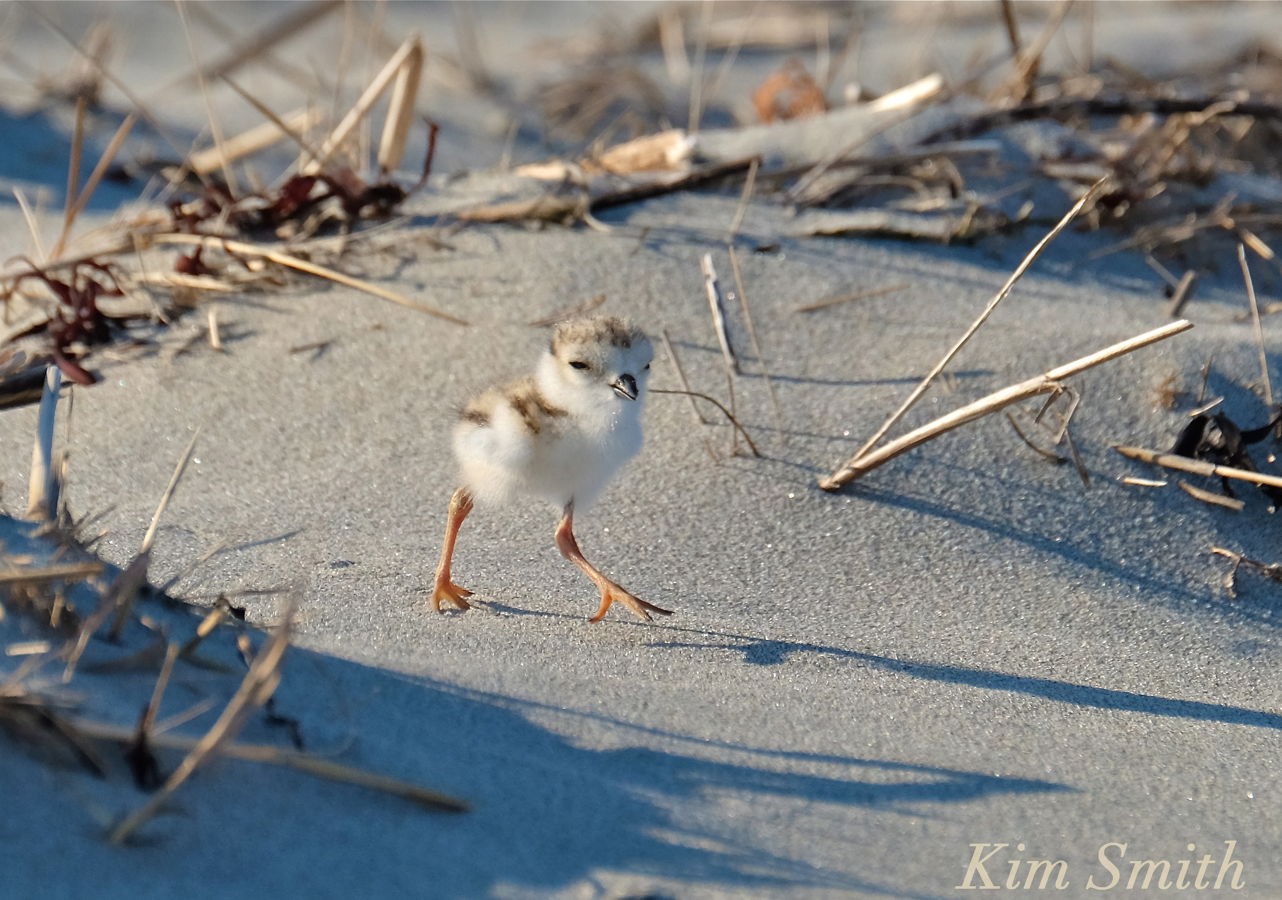 Unlike songbirds, the Piping Plover chicks leave the nest almost immediately. They are not fed by the adults and begin to forage for insects in the sand soon after hatching. Although only hours old, they can run, and run they do, looking mostly like jet propelled cotton balls.