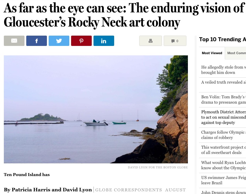 Where artists still live and work. Article mentions Rocky Neck Historic Art Trail, Elynn Kroger, Robert Gruppe, John Nesta, open air painters, and more. By Patricia Harris and David Lyons
