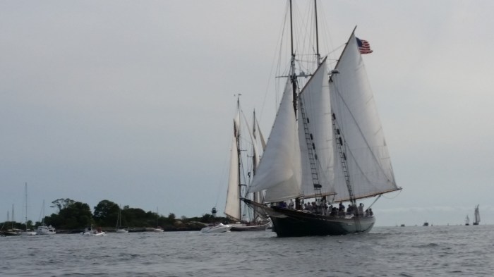 During last evening’s Schooner Festival Mayor’s Reception opening festivities, a moving song of tribute to Kay Ellis was sung by Allen Estes. The Schooner Lannon wended past during the performance.