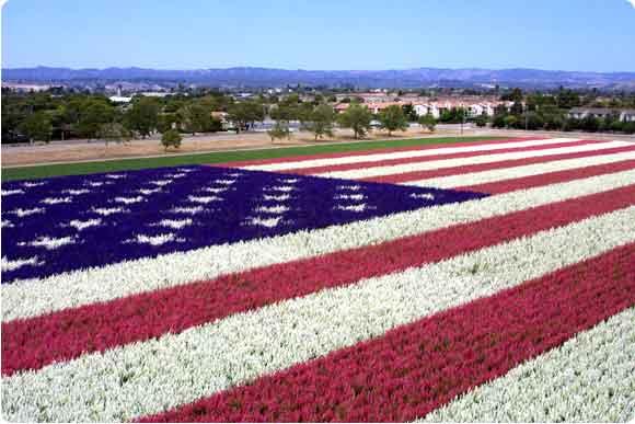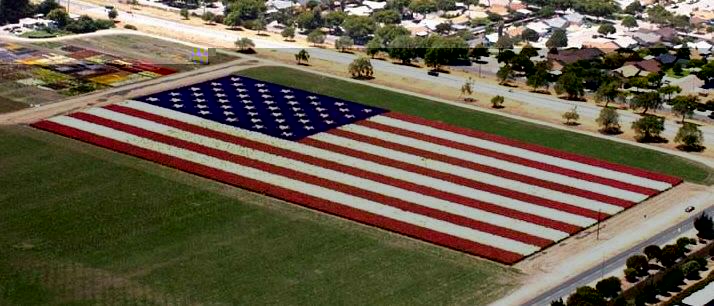 This flag was the first Floral Flag to be planted with 5 pointed stars, comprised of white Larkspur. Each star is 24 feet in diameter, each stripe is 30 feet wide. This flag is estimated to contain more than 400,000 Larkspur plants with 4-5 flower stems each, for a total of more than 2 million flowers.