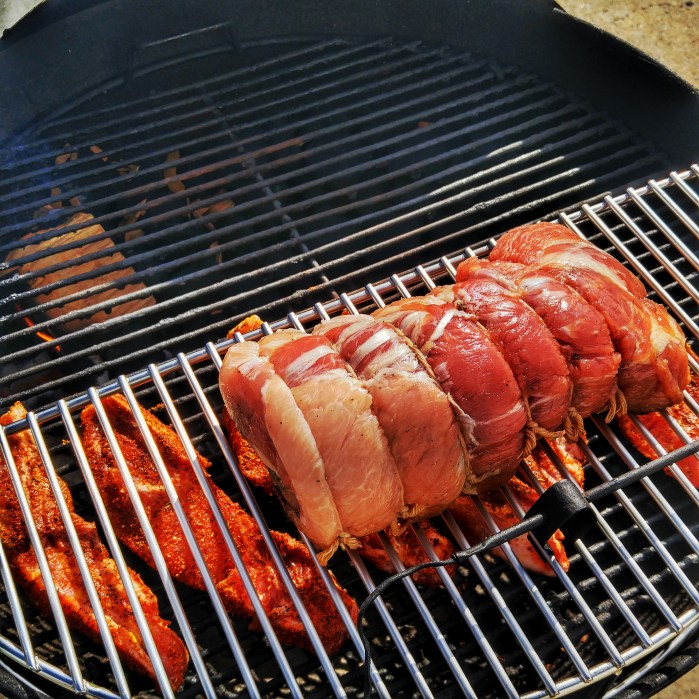 Here is how I started out.  A regular smoke set-up using the snake method.  The Country Style Pork Ribs offset of the coals with apple chunk and cherry wood chips.