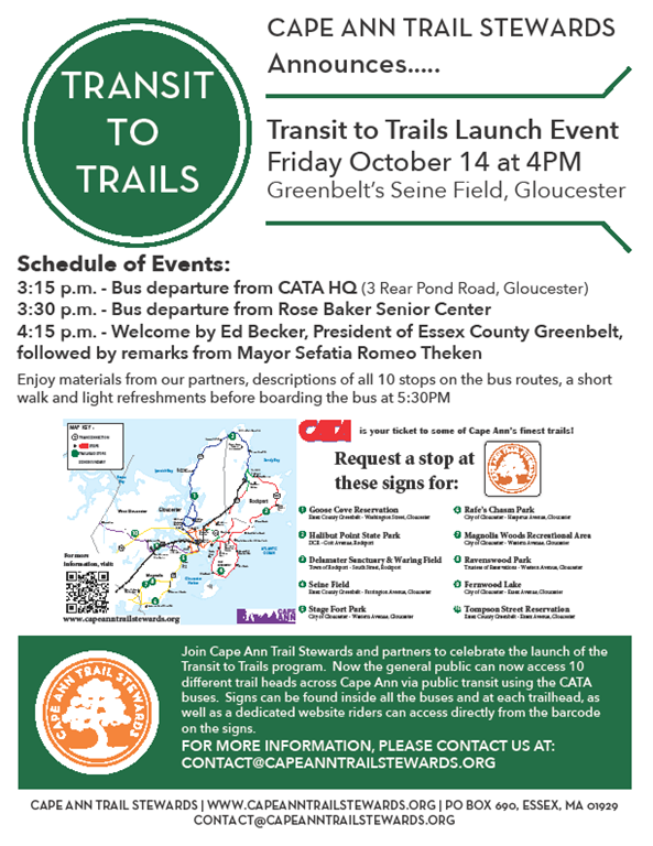 Cape Ann Trail Stewards has partnered with Cape Ann Transit Authority and Mass in Motion Cape Ann to identify 10 open space areas that can be accessed by CATA bus.