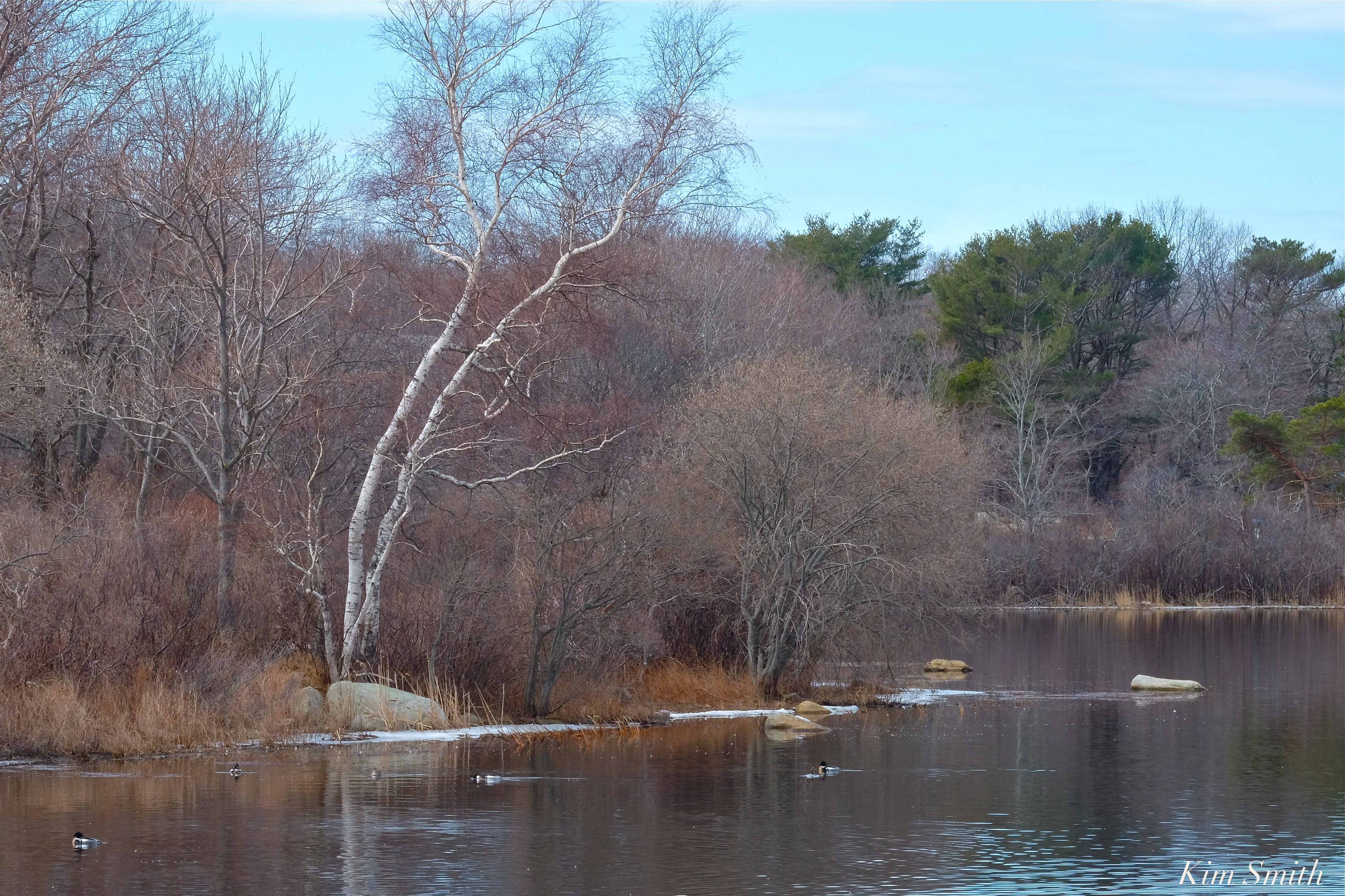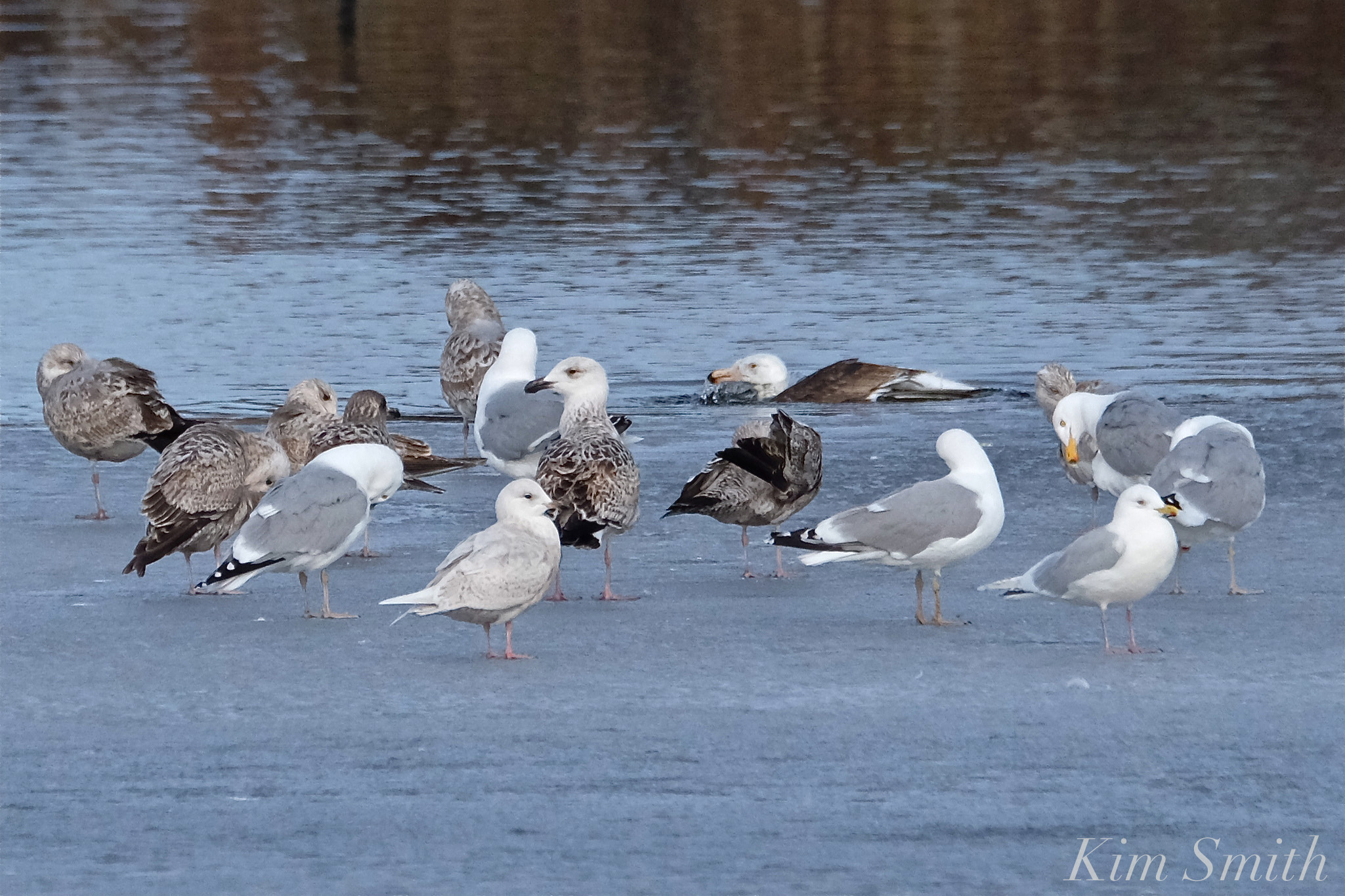 The pretty white gull was on the last remnant of ice at Niles Pond yesterday morning, preening and bathing alongside a mixed flock of Great Black-backed and Herring Gulls. Although doing his/her best to blend with the other gulls, he appeared to be playing with a feather blowing around on the ice.