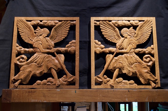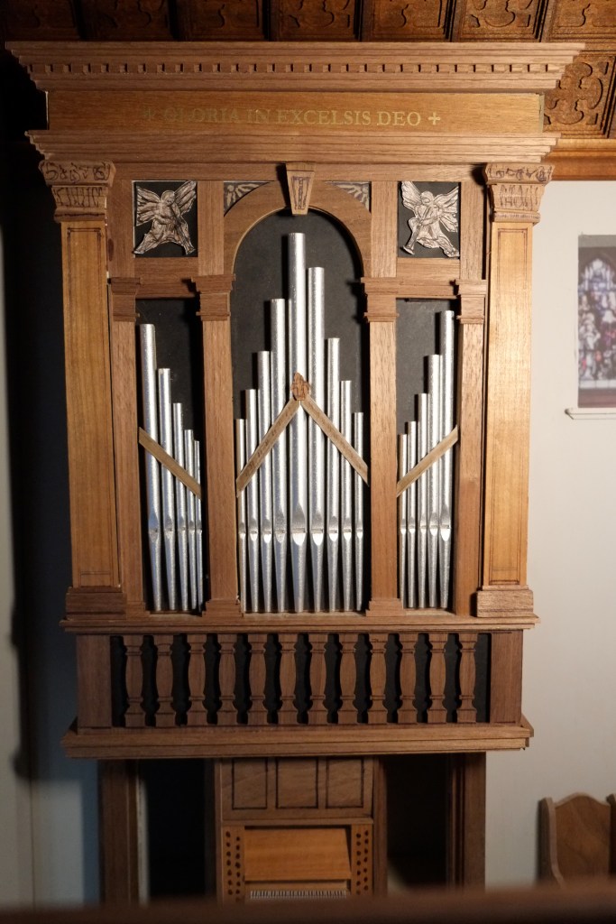 Scale model of Opus 148. Morgan Faulds Pike, sculptress of the Gloucester Fishermen’s Wives Memorial, carved the oak angels and panels for Opus 148. See more here.