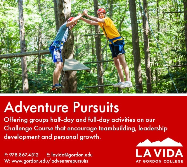 Great opportunity for schools, local businesses and other groups. Team building provides fun and engaging ways for groups to get to know one another and learn how to work and problem solve together. During the challenge course activities, participants experience the power of encouragement and practice facing challenges, testing limits, developing confidence and learning to trust. www.gordon.edu/adventurepursuits