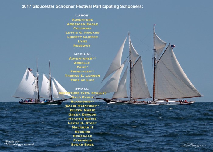 Here you go–the list of 26 schooners participating in the Gloucester 2017 Schooner Festival! Thank you to Len Burgess for sharing, and it is also Len’s beautiful photo in the poster.