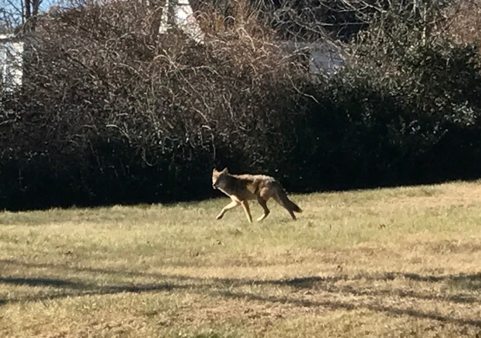 We were driving down Nugent Stretch, from Rockport to Gloucester, yesterday at 10:45 in the morning when Finn swore that he saw a coyote on the side of the road. He made me turn around to prove that he was right….and I was glad that I did. There, rolling around like a puppy in the grass on the lawn of the Sea Lion hotel, was a lone coyote. I drove past him, turned around again, and pulled over safely to take some photos. Yet again only equipped with my iPhone, I sadly couldn’t get great shots, but he was super close and didn’t mind me snapping photos for a little bit before he got up and trotted away to the house next door up on the hill.