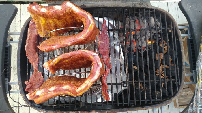 Next filled right side of PK 360 with a full chimney of unlit coals. Placed 10 briquettes in the chimney to get going and dumped on one corner of the unlit coals and sprinkled on some cherry wood for smoke. Put down a sheet of tin foil and aluminum trays on the charcoal grate under where the ribs will be placed on the opposite side of the grill from the coals. Fill the foil pan a quarter of the way with warm water to help retain a moist smoking environment. The foil will keep the bottom of the grill easy to clean from the fat drippings that will render throughout the low and slow cooking session.