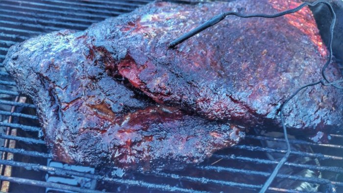 You can see how much fat was trimmed away in this pic. I left a quarter inch or so on the fat cap side which was cooked fave down on the Kettle.