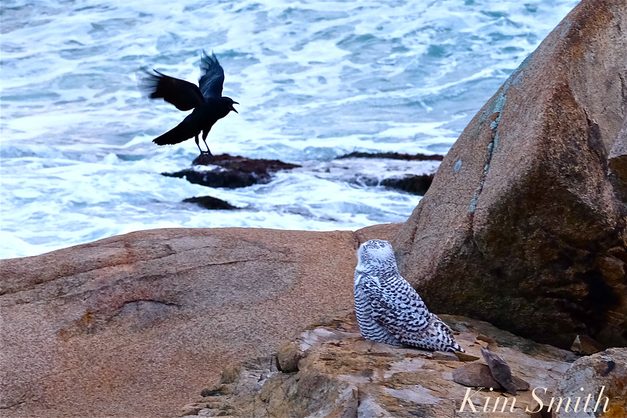 Crow Snowy Owl Gloucester MA -2 copyright Kim Smith