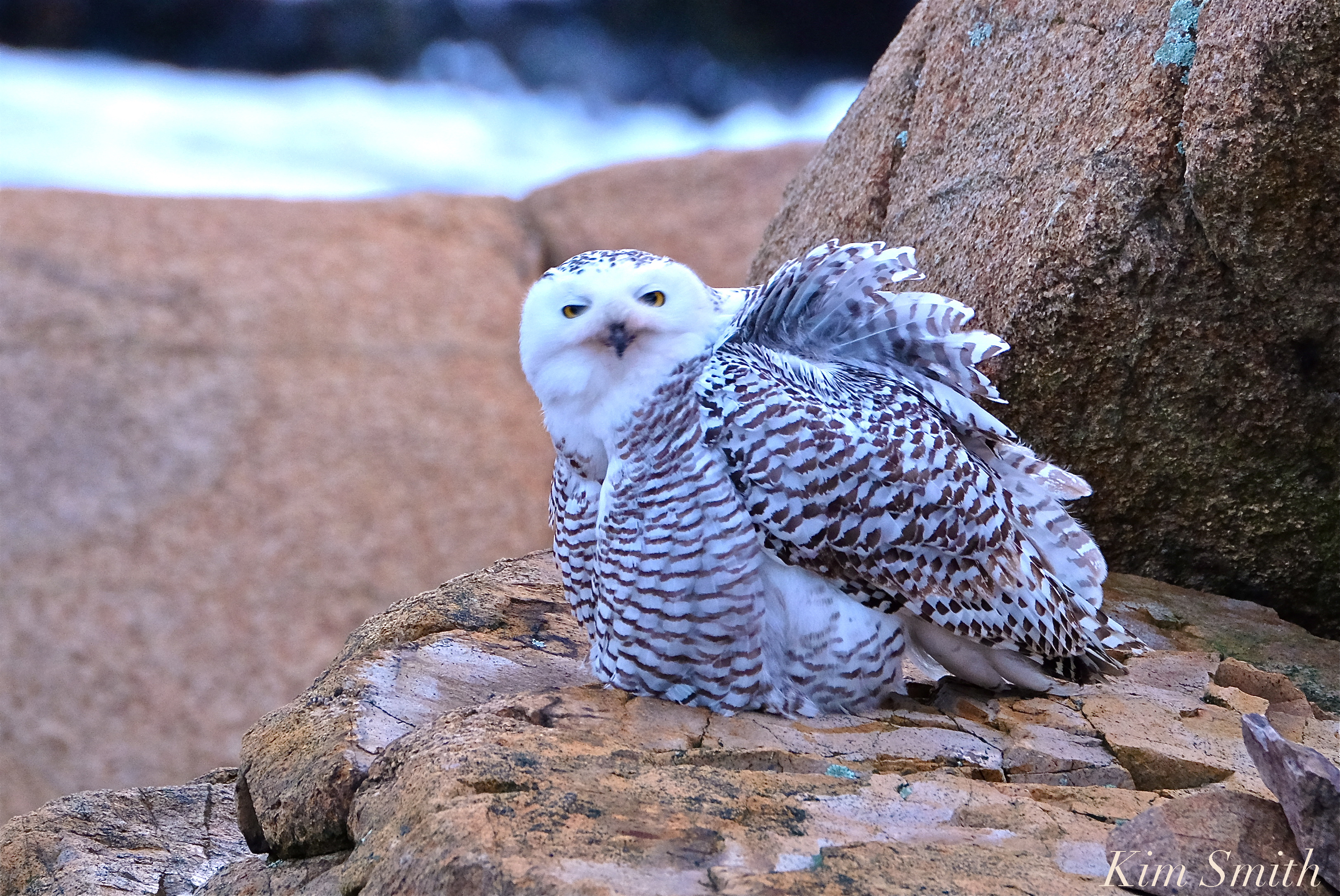 Snowy Owl Female Hedwig Grooming Gloucester MA-2 copyright Kim Smith