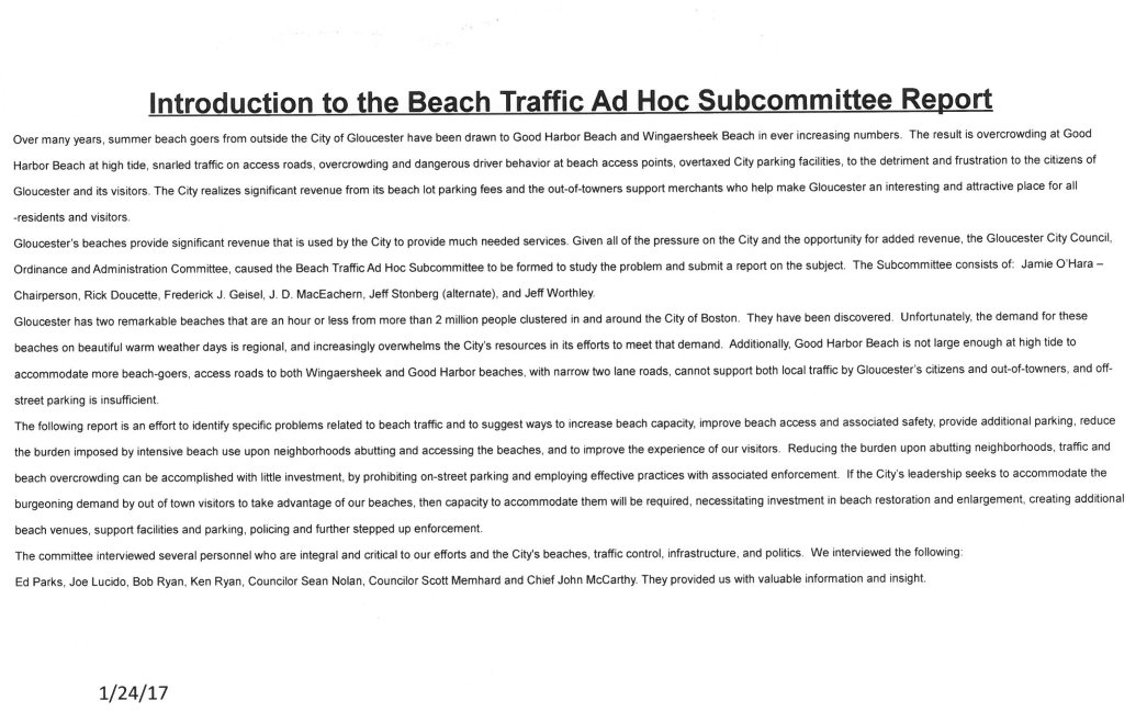 Gloucester Beach Parking and Traffic ad hoc committtee O and A committee Jan 24 2017 presentation to City Council P2 Spread The GMG Love By Sharing With These Buttons:Tweet Click to email a link to a friend (Opens in new window) Email Click to print (Opens in new window) Print Click to share on WhatsApp (Opens in new window) WhatsApp Pocket Click to share on Reddit (Opens in new window) Reddit Like Loading... Published by Catherine posted content / cell phone photos mine, unless otherwise credited (thumbnail portrait of Catherine at MFA, Boston © David Cox photo) https://www.cryanaid.com/ View all posts by Catherine
